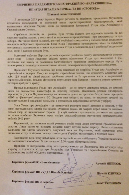 ЗВЕРНЕННЯ ПАРЛАМЕНТСЬКИХ ФРАКЦІЙ ВО «БАТЬКІВЩИНА», ПП «УДАР ВІТАЛІЯ КЛИЧКА» ТА ВО «СВОБОДА» Шановні співвітчизники! 13 листопада 2013 року фракція Партії регіонів за вказівкою президента Януковича провалила голосування за ключовий пакет євроінтеграційних законопроектів, який гарантовано відкривав Україні шлях до підписання історичної Угоди про Асоціацію з Європейським Союзом. Українська опозиція, як і раніше, була готова віддати сто відсотків голосів за всі євроінтеграційні закони, у тому числі за недосконалі президентські – про прокуратуру та про вибори. Ми також пішли на важкі, але такі необхідні компроміси у питанні щодо подолання наслідків вибіркового правосуддя. Сама Юлія Тимошенко неодноразово чітко та публічно виступала із закликами не ставити підписання Угоди в залежність від її особистої подальшої долі, якою б важкою вона не була. Відвертий саботаж Партією регіонів євроінтеграційного пакету законопроектів означає лише одне – Віктор Янукович свідомо зриває підписання Угоди про Асоціацію з ЄС, позбавляє нас шансу на реалізацію багатовікового прагнення українського народу: бути повноправною та невід’ємною частиною вільної, демократичної європейської спільноти. Президент Янукович показав, що йому насправді не потрібна Угода про Асоціацію та європейські стандарти. Йому не потрібні європейські закони, які працюють однаково для всіх. Цій владі не цікаві реальні проблеми людей та їх прагнення жити в нормальній європейській країні. Владою Януковича керує лише одне бажання – якомога довше правити і безкарно грабувати країну. Провал підписання Угоди про Асоціацію – це не просто державна зрада, це прямий шлях до економічної катастрофи та дефолту України. Виснажена роками бездарного керівництва урядом Януковича-Азарова економіка довго не протягне без рятівних кредитів МВФ та фінансової допомоги ЄС. Бюджет вже тріщить по швах, не вистачає грошей на виплату зарплат і соціальної допомоги, а промислове виробництво котиться у прірву. Зрив Угоди про Асоціацію – це неминучий розворот нашої держави в минуле, у бік дикої неорадянської імперії під назвою «Митний союз». Це закриті перед нами та нашими дітьми двері до цивілізованої Європи. Це клуб довічних президентів, до якого так прагне вступити особисто Янукович через наміри сфальсифікувати результати президентських виборів 2015 року. Переконані, що зупинити такий розвиток подій може лише потужний громадянський спротив. Лише разом ми зможемо змусити владу почути голос народу. Лише спільними зусиллями ми здатні забезпечити потужний тиск на Януковича, який переконає його підписати Угоду та відмовитися від планів здати Україну, як склотару, в Митний союз. Закликаємо всіх, кому небайдужа доля європейського майбутнього України незалежно від політичних вподобань: 24 листопада о 12.00 зібратися в Києві. Прийдіть та підтримайте одну категоричну вимогу до Януковича, яка об’єднує цілу Україну – підписати Угоду про Асоціацію між Україною та Європейським Союзом на Вільнюському саміті «Східного партнерства». Керівник фракції ВО «Батьківщина» Арсеній ЯЦЕНЮК Керівник фракції ПП «УДАР Віталія Кличка» Віталій КЛИЧКО Керівник фракції ВО «Свобода» Олег ТЯГНИБОК
