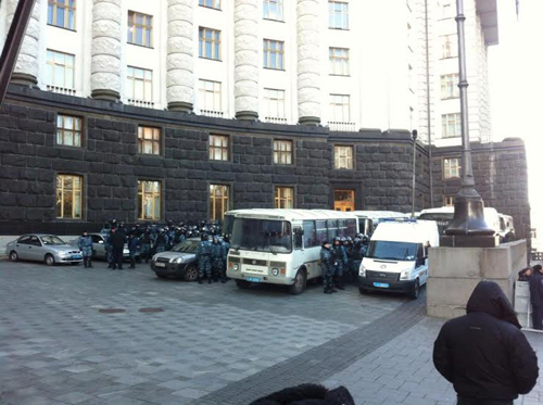 Також у подвір'ї уряду розташовані додаткові сили міліції у повному бойовому спорядженні. Навпроти будівлі, у Маріїнському парку, стоять понад 50 автобусів з "Беркутом", а також особи характерної зовнішності. Як відомо, голова Політради ВО “Батьківщина” та фракції “Батьківщина” Арсеній Яценюк, голова фракції УДАР Віталій Кличко та ВО “Свобода” Олег Тягнибок мають намір прибути на засідання Кабінету міністрів.