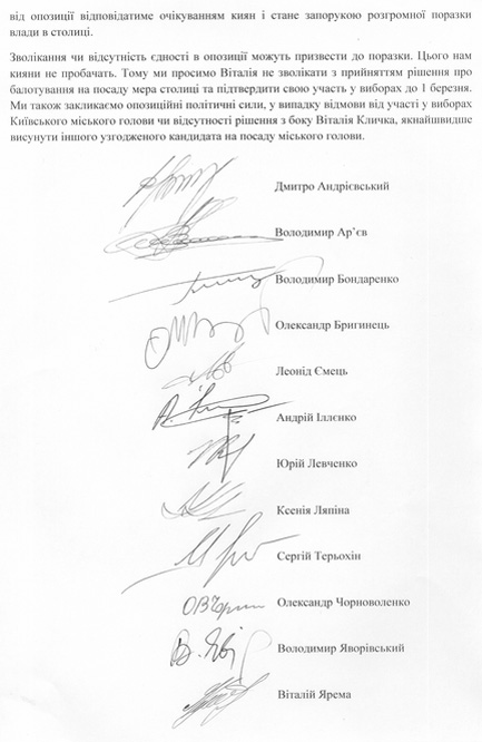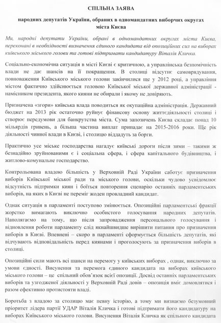 міста Києва Ми, народні депутати України, обрані в одномандатних округах міста Києва, переконані в необхідності визначення єдиного кандидата від опозиційних сил на виборах київського міського голови та готові підтримати кандидатуру Віталія Кличка. Соціально-економічна ситуація в місті Києві є критичною, а управлінська безпомічність влади не дає шансів на її покращення. В столиці відсутнє самоврядування, повноваження Київського міського голови закінчилися ще у 2012 році, а управління містом фактично здійснюється головою Київської міської державної адміністрації - намісником президента, якого кияни не обирали і якому не довіряють. Призначена «згори» київська влада поводиться як окупаційна адміністрація. Державний бюджет на 2013 рік остаточно руйнує фінансову основу життєдіяльності столиці і створює передумови для банкрутства міста. Сума запозичень Києва складає понад 10 мільярдів гривень, а більша частина виплат припадає на 2015-2016 роки. Ще рік діяльності чинної влади в Києві, і столицю віддадуть за борги. Практично усе міське господарства нагадує київські дороги після зими – такими ж безнадійно зруйнованими є і соціальна сфера, і сфера капітального будівництва, і житлово-комунальне господарство. Контрольована владою більшість у Верховній Раді України саботує призначення виборів Київської міської ради та міського голови, оскільки чудово усвідомлює відсутність підтримки киян і боїться повторення сценарію останніх парламентських виборів, на яких в Києві не переміг жоден провладний кандидат. Однак ситуація в парламенті поступово змінюється. Опозиційні парламентські фракції жорстко вимагають виключно особистого голосування народних депутатів. Наполягаємо на тому, що після запровадження персонального голосування і відновлення роботи парламенту слід якнайшвидше вирішити питання про призначення виборів в Києві. Впевнені – скоро в парламенті сформується більшість депутатів, які відчувають відповідальність перед киянами і проголосують за призначення виборів в столиці. Опозиційні сили мають всі шанси на перемогу у київських виборах, однак, виключно за умови єдності. Висунення та перемога єдиного кандидата на виборах київського міського голови – це спільний обов’язок всієї опозиції. Досвід останніх парламентських виборів та узгодженої діяльності у Верховній Раді довів – опозиція вміє домовлятися і разом ефективно протистояти владі. Боротьба з владою за столицю має певну історію, а тому ми визнаємо безумовний пріоритет лідера партії УДАР Віталія Кличка і готові підтримати його кандидатуру на виборах Київського міського голови. Висунення Віталія Кличка як спільного кандидата від опозиції відповідатиме очікуванням киян і стане запорукою розгромної поразки влади в столиці. Зволікання чи відсутність єдності в опозиції можуть призвести до поразки. Цього нам кияни не пробачать. Тому ми просимо Віталія не зволікати з прийняттям рішення про балотування на посаду мера столиці та підтвердити свою участь у виборах до 1 березня. Ми також закликаємо опозиційні політичні сили, у випадку відмови від участі у виборах Київського міського голови чи відсутності рішення з боку Віталія Кличка, якнайшвидше висунути іншого узгодженого кандидата на посаду міського голови.