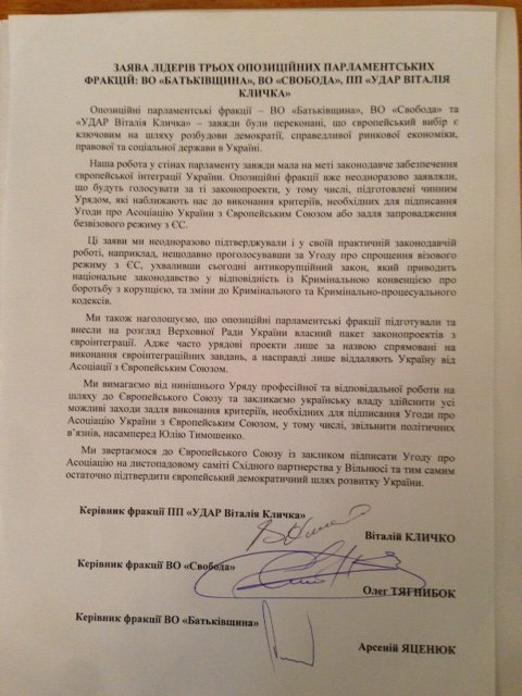 Голови опозиційних парламентських фракцій - ВО «Батьківщина» Арсеній Яценюк, ВО «Свобода» Олег Тягнибок та УДАР Віталій Кличко - звернулися до Європейського Союзу із закликом підписати Угоду про Асоціацію на листопадовому саміті Східного партнерства у Вільнюсі та тим самим остаточно підтвердити європейський демократичний шлях розвитку України. Повний текст заяви:
