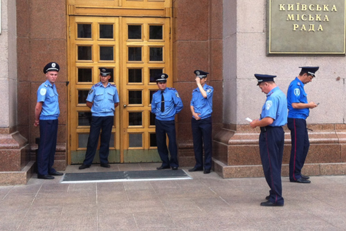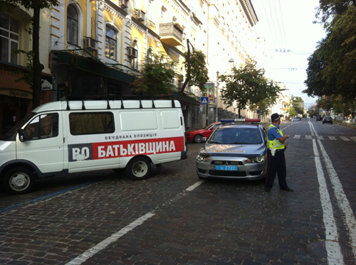 На площу біля Київської міськдержадміністрації, де має розпочатися мітинг проти незаконної сесії Київради, міліція не пропустила автомобілі “Батьківщини” з технічним забезпеченням. Площа очеплена міліцією та машинами ДАІ. Сьогодні вранці на вул. Прорізна працівники ДАІ під головуванням капітана міліції Ігоря Пастуха незаконно зупинили автомобілі ВО “Батьківщина”, які перевозили на площу біля КМДА звукопідсилювальну апаратуру. Правоохоронці заблокували рух авто. На питання, яка причина зупинки, працівник міліції повідомив, що в нього є відповідний наказ, проте відмовився повідомити, хто видав цей наказ і на кого він розповсюджується.