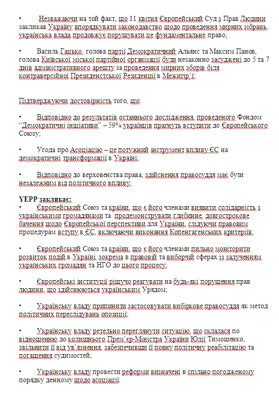 Як зазначено у резолюції, опублікованому сьогодні «після проведення Президентських виборів в Україні в 2010 році, Віктор Янукович та його Адміністрація розпочали згортання демократії та відхід від Європейських цінностей, а також розпочали політичні переслідування лідерів опозиції».