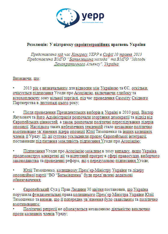 Резолюція YEPP щодо ситуації в Україні була ініційована «Батьківщиною Молодою” та “Молоддю Демократичного Альянсу”. Делегати Конгресу ухвалили її одностайно.