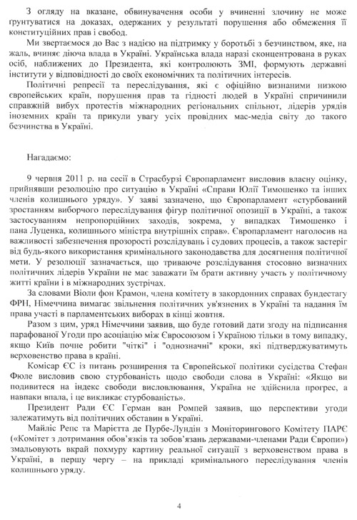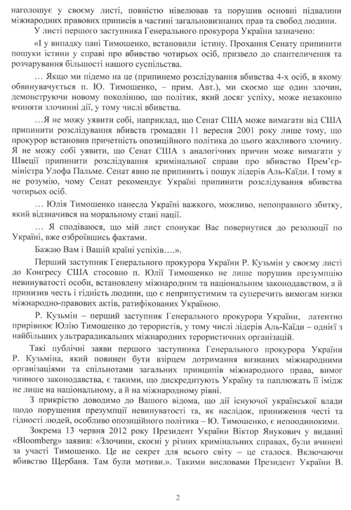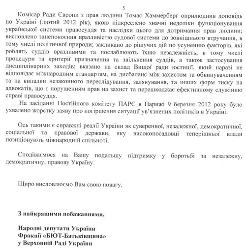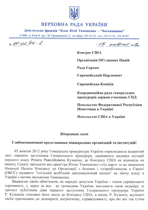 Депутати фракції «БЮТ-Батьківщина» надіслали відкритого листа Конгресу США, Організації Об’єднаних Націй, Раді Європи, Європейському Парламенту, Координаційній раді генеральних прокурорів країн СНД, Посольству Федеративної республіки Німеччина в Україні та Посольству США в Україні. У документі за підписом 75 народний депутатів фракції висловлюється протест діям першого заступника генерального прокурора України Рената Кузьміна, який у своєму листі до Сенату США щодо лідера опозиції Юлії Тимошенко «повністю нівелював та порушив основні підвалини міжнародних правових приписів у частині загальновизнаних прав та свобод людини». Зокрема, депутати наголошують, що Р.Кузьмін не лише порушив презумпцію невинуватості особи, встановлену міжнародним та національним законодавством, а й принизив честь та гідність людини, що є неприпустимим та суперечить вимогам низки міжнародно-правових актів, ратифікованих Україною. Водночас, депутати звертають увагу на те, що політичні репресії та переслідування лідерів опозиції в Україні є офіційно визнаними низкою європейських країн. Системні порушення прав та гідності людей в Україні спричинили справжній вибух протестів міжнародних регіональних спільнот, лідерів урядів іноземних країн та прикували увагу усіх провідних мас-медіа світу до такого безчинства в Україні. «Ми звертаємося до вас з надією на підтримку у боротьбі з безчинством, яке, на жаль, вчиняє діюча влада в Україні», - наголошується в листі. Текст листа: