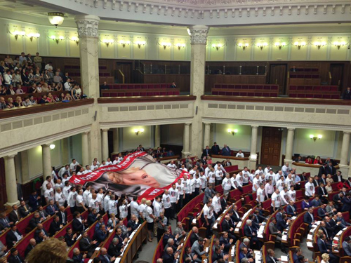 Народні депутати - члени фракції "Батьківщина" прийшли на пленарне засідання Верховної Ради у футболках із зображенням лідера опозиції Юлії Тимошенко та написом "Юлі - волю!". Коли до сесійної зали увійшов президент Віктор Янукович, депутати почали голосно скандувати «Юлі – волю!».