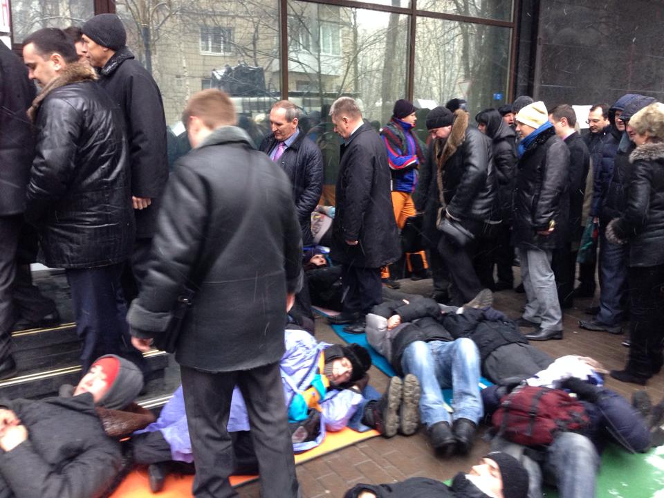 Під будівлею Генеральної прокуратури України відбувається лежача акція протесту під гаслом «Переступив через закон - переступи через нас». Активісти з Майдану лежать на всіх входах до ГПУ таким чином, що зайти в будівлю можна, лише переступивши через людей.