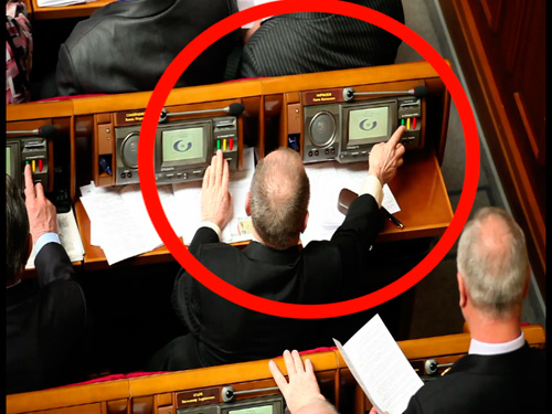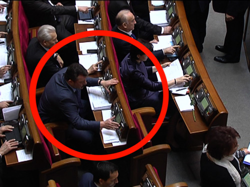 Депутати провладної більшості продовжують порушувати принцип персонального голосування, голосуючи одразу за кількох осіб. Так, на сьогоднішньому засіданні Верховної Ради у «кнопкодавстві» були помічені члени Партії регіонів Віталій Борт, Тетяна Бахтеєва, Станіслав Скубашевський, Олександр Кузьмук, а також комуніст Василь Самойленко. Віталій Борт (Партія регіонів) голосує за Валерія Омельченка (Партія регіонів):