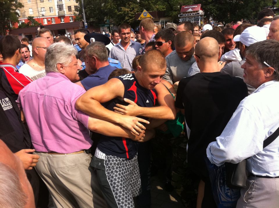 Натомість працівники міліції відмовляються затримувати організаторів бійки. Люди спортивної статури продовжують поводитися агресивно, нецензурно висловлюючись і провокуючи нові конфлікти. З самого ранку прихильники Партії регіонів на чолі з Олегом Калашніковим встановили біля суду звукопідсилюючу апаратуру. Між виступами Калашнікова постійно звучить пісня «Єднаймося, єднаймося».