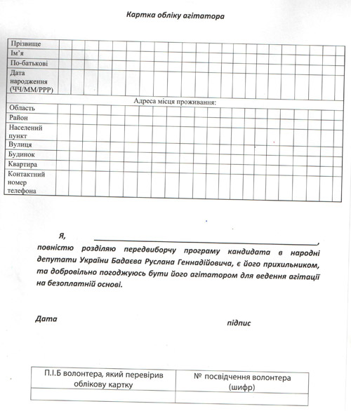 У 94-му виборчому окрузі (Київська обл.) працівникам бюджетних установ та комунальних підприємств роздають анкети, в яких пропонується стати прихильником і "безкоштовним агітатором" провладного кандидата Руслана Бадаєва. Таку інформацію поширила прес-служба опозиційного кандидата у народні депутати Віктора Романюка. За заповнення такої "картки обліку агітатора" платять 200 грн. В анкеті від громадян вимагається поставити підпис під наступним: "Я, прізвище ім'я по батькові, повністю розділяю передвиборчу програму кандидата в народні депутати України Бадаєва Руслана Геннадійовича, є його прихильником, та добровільно погоджуюсь бути його агітатором для ведення агітації на безоплатній основі". Крім того, в анкеті необхідно вказати місце проживання, дату народження, контактний телефон.