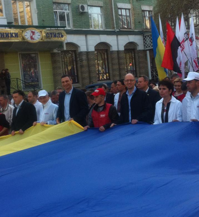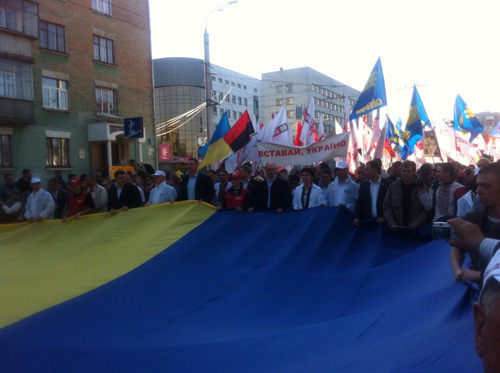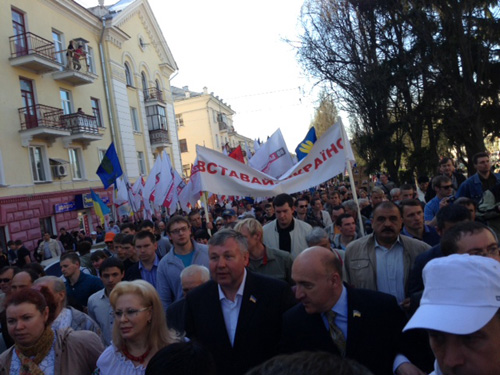 Кілька тисяч людей рушили маршем у рамках загальнонаціональної акції «Вставай, Україно!» в Чернігові в п’ятницю, 26 квітня. Колона, яку очолюють лідери опозиції: голова парламентської фракції «Батьківщина» Арсеній Яценюк, фракції «Удар» Віталій Кличко та ВО «Свобода» Олег Тягнибок, - рушила проспектом Миру до Красної площі, де відбудеться мітинг. Попереду колони активісти розгорнули величезний національний прапор.