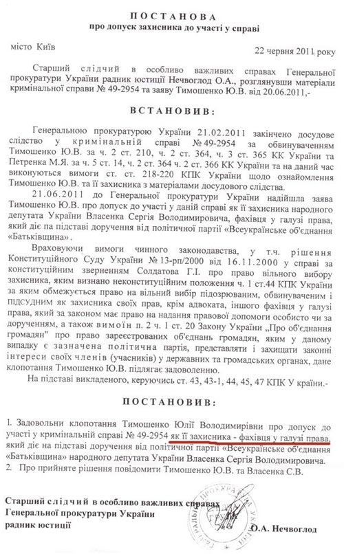 Документ, який підтверджує, що Сергій Власенко допущений до справи Юлії Тимошенко як захисник, а не адвокат: