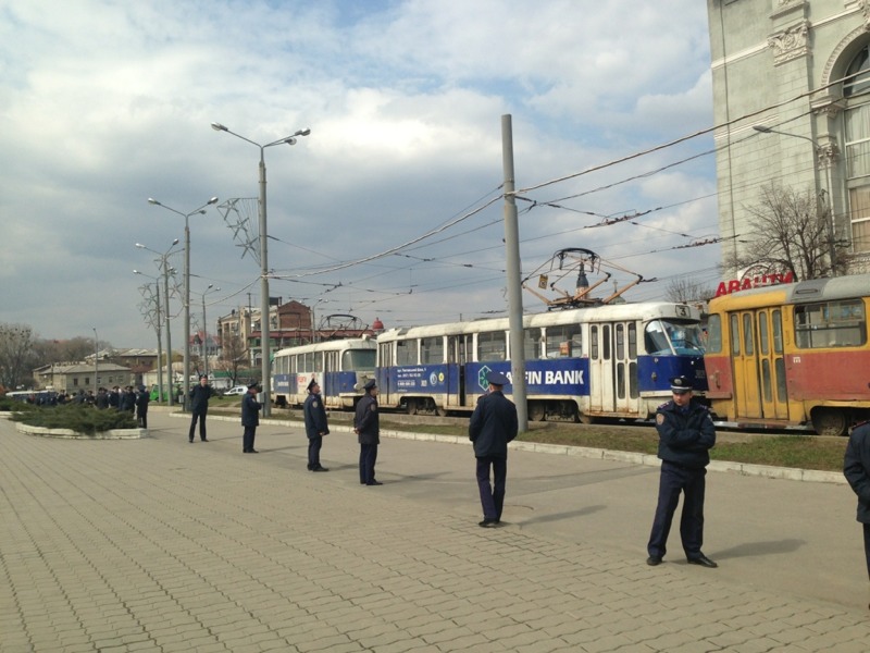 Площа Рози Люксембург в Харкові, звідки о 15.00 має рушати марш «Вставай, Україно!», повністю заблокована зчепленими трамваями та живим колом міліціонерів. Рух по маршруту ходи заблоковано автозаками, автобусами, вантажівками.