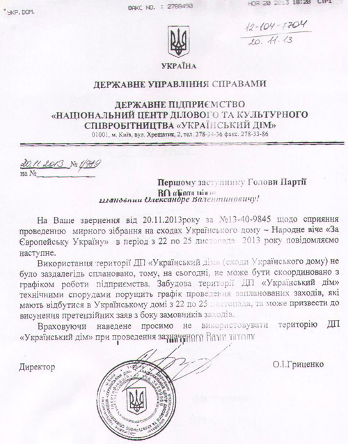 Керівництво ДП "Український дім", що входить до складу Державного управління справами, просить опозицію не використовувати сходи будівлі для проведення запланованого на неділю, 24 листопада, Народного Віча "За Європейську Україну!". Про це йдеться у листі директора ДП "Український дім" Оксани Гриценко, адресованому партії "Батьківщина". Раніше юристи партії звернулися до керівництва ДУС та ДП "Український дім" з проханням посприяти проведенню вказаного заходу і безперешкодної зустрічі народних депутатів з виборцями (відповідно до ст.39 Конституції України, ч.10 ст. 17 Закону України "Про статус народного депутата України").