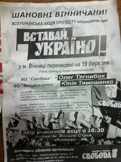У Вінниці з’явилися фальшиві листівки та повідомлення у ЗМІ про начебто перенесення дати маршу в рамках акції «Вставай, Україно!», який відбудеться в четвер, 14 березня. Сьогодні вранці у Вінниці почали поширюватися листівки, радіо– та Інтернет-повідомлення про начебто перенесення часу проведення маршу та мітингу в рамках акції «Вставай, Україно!» на 19 березня. У «Батьківщині» переконані, що такі намагання влади зірвати акцію - це ще одне свідчення того, що влада боїться опозиції та народу.