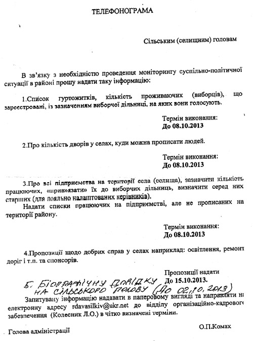 Серед іншого у селищних голів запитують «пропозиції щодо добрих справ у селах, як, наприклад: освітлення, ремонт доріг» і спонсорів, які можуть це профінансувати. У телефонограмі міститься вимога надати всі ці дані до 8 жовтня. Як відомо, кандидат в народні депутати від партії «Батьківщина» Віктор Романюк на минулих парламентських виборах переміг висуванця Партії регіонів Тетяну Засуху у 94-му виборчому окрузі. Однак Окружна виборча комісія визнала недійсним голосування на 27 дільницях округу та відмовилася враховувати понад 30 тисяч голосів. Через переслідування з боку влади Романюк був змушений відбути до Італії.