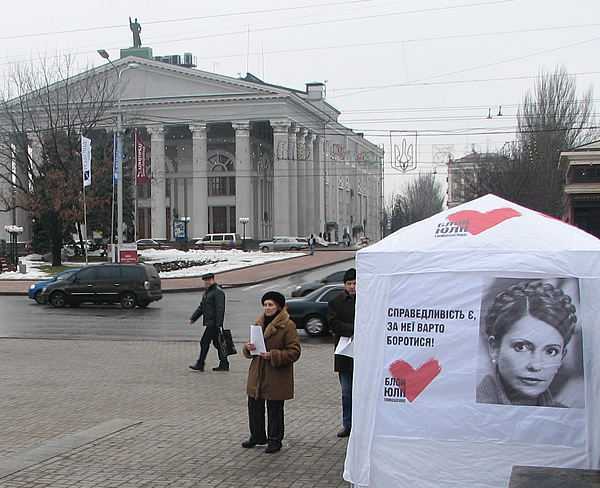Активисты Блока Юлии Тимошенко установили палатку на площади Ленина, в центре города, где депутат Ворошиловского районного в городе Донецке совета Алексей Мацука вел публичный прием граждан, жителей района.