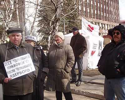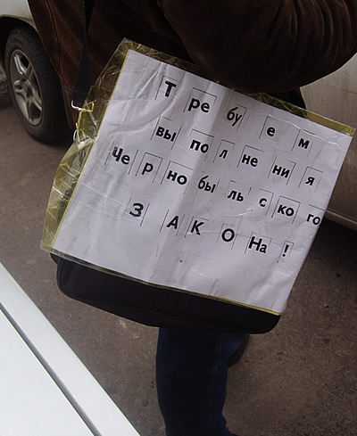 На палатках чернобыльцев висят плакаты «Якименко, верни наши пенсии», «Нет Чернобыля правового, после Чернобыля ядерного», «БЮТ за чернобыльцев».