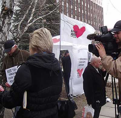 Также у 12 чернобыльцев, принимающих участие в голодовке, на головах повязаны повязки с надписью «Голодовка».