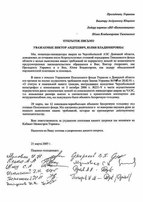 В связи с отказом Управления Пенсионного фонда Украины в Донецкой области его органов на местах осуществить требования норм Закона Украины №798 от 28.02.91 г. «О статусе и социальной защите граждан, пострадавших вследствие Чернобыльской катастрофы» с изменениями от 5 октября 2006 г. №231-V в части осуществления перерасчетов ранее назначенных пенсий по инвалидности ликвидаторам аварии на ЧАЭC, т.е. повышения размера выплат в соответствие с прожиточным минимумом для нетрудоспособных лиц, мы вынуждены были объявить бессрочную голодовку.