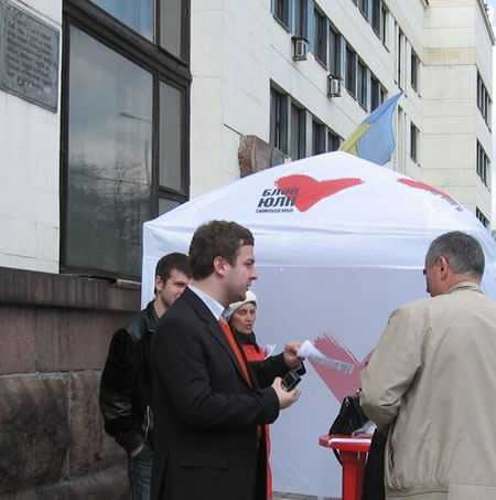 Депутат Ворошиловского районного в городе Донецке совета Алексей Мацука (БЮТ) открыл свою депутатскую приёмную прямо у входа в здание совет. Приемная оформлена в виде палатки и стоит с 19 апреля.