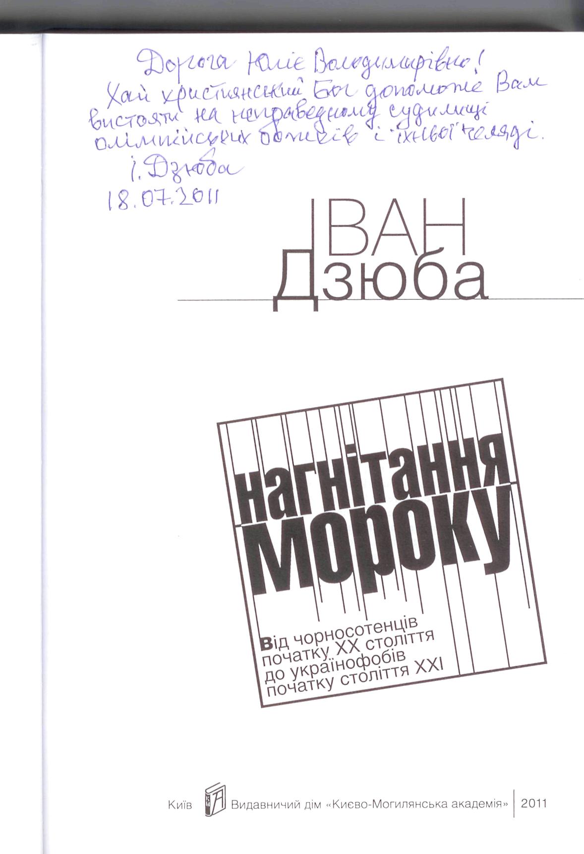 Ці слова лауреат Шевченківської премії залишив як автограф на новій своїй книзі, яку з теплими побажаннями передав Юлії Тимошенко. Збірка Івана Дзюби «Нагнітання мороку. Від чорносотенців початку ХХ століття до українофобів початку століття ХХІ» побачила світ у видавничому домі «Києво-Могилянська академія» за сприяння Фундації імені Івана Багряного.