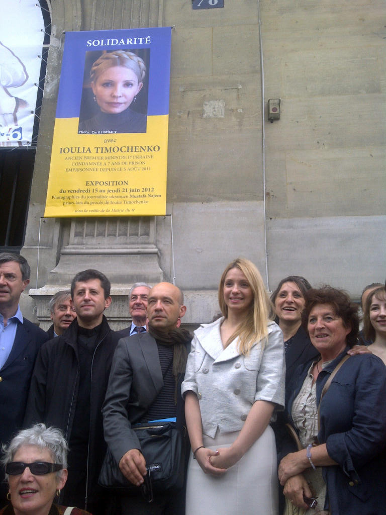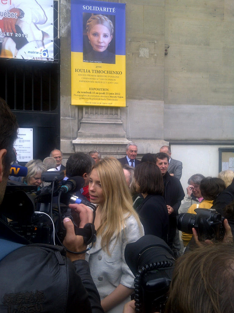 Сьогодні донька лідера опозиції Юлії Тимошенко Євгенія взяла участь в акції на підтримку її ув‘язненої матері у Парижі. За декілька годин до матчу Україна-Франція на Євро-2012 мер 6-го округу Парижа, Член Ради Парижа Жан-Пєр Лекок та президент Представницького комітету української громади у Франції Наталі Пастернак вивісили на фасаді мерії портрет Юлії Тимошенко, яка з 5 серпня 2011 року перебуває за ґратами. «Напередодні матчу нашої збірної ми демонструємо свою солідарність з Юлією Тимошенко та іншими ув‘язненими політиками. Те, що зараз відбувається Україні, є неприйнятним для будь-якої демократичної країни», - заявив Жан-Пєр Лекок. «Демократи всього світу обурені поводженням української влади зі своїми опонентами», - додав він. Євгенія Тимошенко подякувала учасникам акції за підтримку та наголосила, що її мама навіть у в‘язниці продовжує боротися за європейське майбутнє України. «Моя мама вдячна за Вашу підтримку. Вона твердо переконана, що місце України в об‘єднаній Європі, де панує демократія, де не порушуються права людини, а політичних опонентів не кидають за грати», - сказала вона.