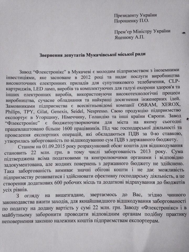 Він зазначив, що Мукачівська філія заводу Flextronics хоче створити додаткових 600 робочих місць. Хоче, бо має додаткові замовлення. Але не може, бо держава фактично пограбувала їх на 22 мільйони гривень. Через це підприємство, яке без перебільшення є одним із найбільш технологічно розвинених в України, позбавлене оборотних коштів.