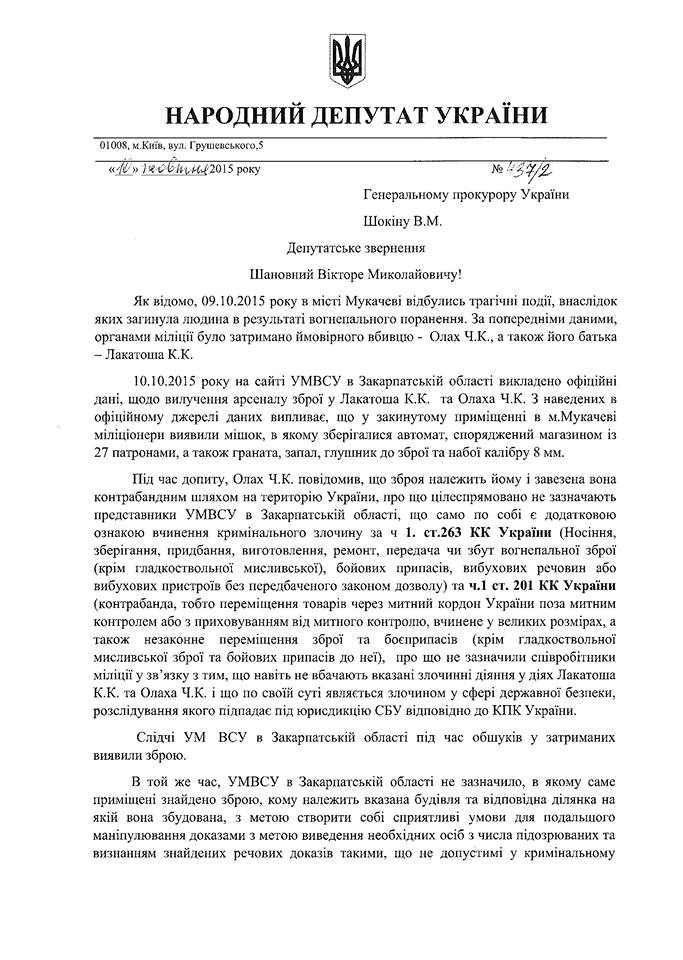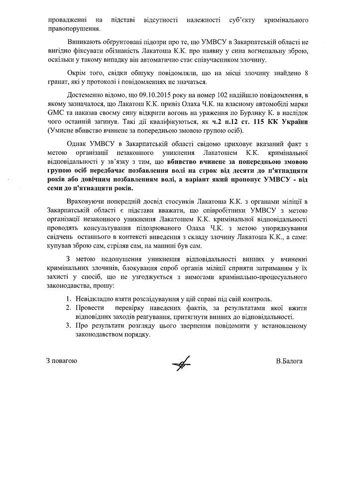 Віктор Балога офіційно звернувся до Генпрокурора з вимогою взяти на контроль справу щодо мукачівського вбивці