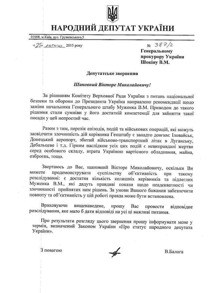 «Так як усім чомусь бракує сміливості заявити про це в голос, чи тим більше, звернутися в Генеральну прокуратуру, то таку відповідальність на себе взяв я. Дуже розраховую на оперативну реакцію Генерального прокурора. Можливо, хоча б кримінальна справа, порушена проти Муженка, змусить Президента ухвалити рішення про його негайне звільнення. А далі ним нехай займаються слідчі. Тим більше, бажаючих розповісти усе в подробицях більше, ніж достатньо», - зазначив Віктор Балога.