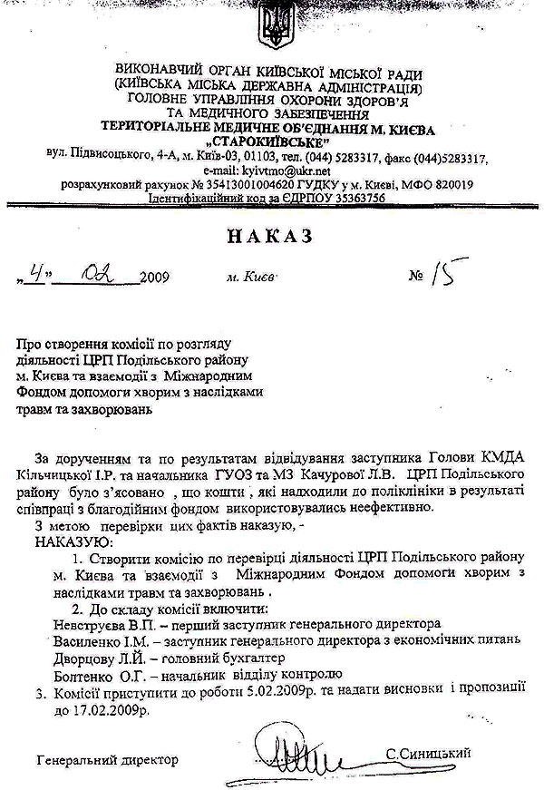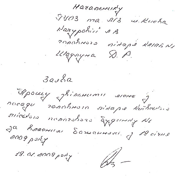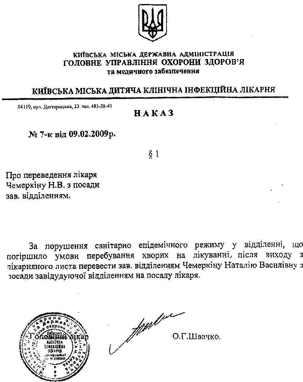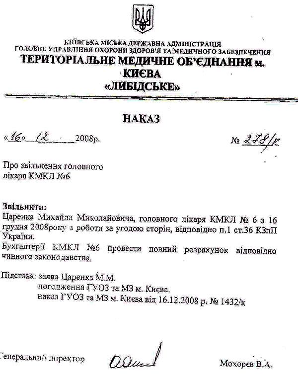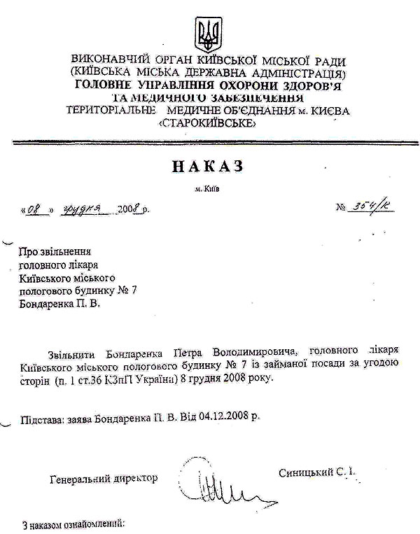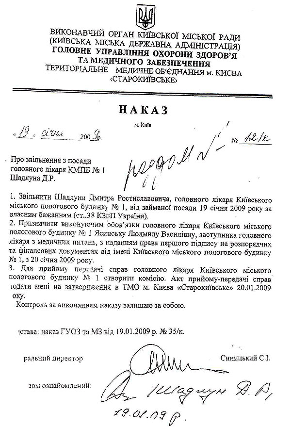 Також вона зазначила, що мова про звільнення головного лікаря КМПБ №1 Шадлуна Д.Р. йшла ще в грудні 2008 року, і тоді він написав заяву на відпустку і відразу ж на звільнення за власним бажанням і був звільнений 19 січня 2009 року.