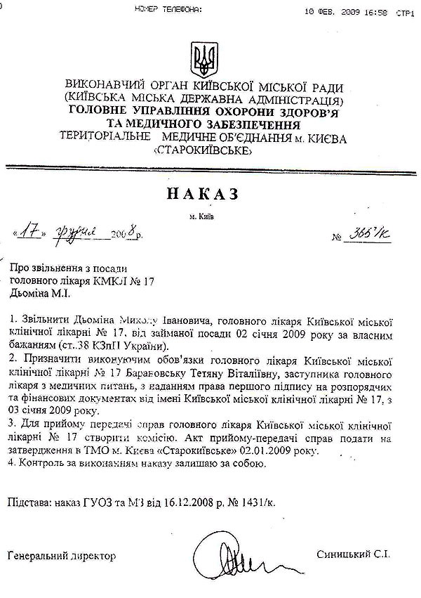 «Інформація, яку розповсюджує колишній головний лікар Київської міської клінічної лікарні №17 Дьомін М.І., стосовно звільнення його з займаної посади через відмову забезпечити присутність лікарів у мітингу, не відповідає дійсності. Адже він був звільнений з посади за власним бажанням ще 17 грудня 2008 року», - додала перший заступник голови КМДА.