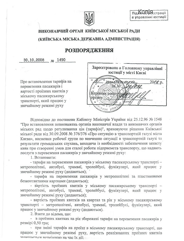 зареєстровано в Головному управлінні юстиції у місті Києві і набуло чинності з моменту оприлюднення 4 листопада 2008 року. Таким чином, столична влада виконала рішення Київської ради від 30 вересня 2008 року - тоді 95 депутатів проголосували за розробку нової сітки граничних тарифів у громадському транспорті. В результаті, з 4 листопада одна поїздка в метрополітені буде коштувати 2 гривні, якщо пасажир купуватиме один жетон на проїзд. У наземному транспорті ціна 1 поїздки становитиме 1,5 грн., якщо купити квиток завчасно в кіоску, і 2 гривні, якщо купити в салоні автобусу, трамваю чи тролейбусу. Але якщо пасажир придбає багаторазовий проїзний квиток, він значно зекономить на кожній поїздці, оскільки для довгострокових проїзних збережено поточну вартість проїзду.