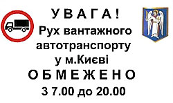 Згідно з , рух транзитного вантажного транспорту територією міста дозволяється з 20-00 год. до 7-00 год. лише вулицями і площами, які не входять до центру столиці: проспект Бажана, Столичне шосе, вулиця Академіка Заболотного, Одеська площа, Кільцева дорога, проспект Академіка Палладіна, Гостомельська площа, вулиця Міська (на ділянці від площі Гостомельської до перехрестя з Гостомельським шосе), Гостомельське шосе, Нова дорога (Київського міського напівкільця), Мінський проспект, площа Тараса Шевченка, вулиця Полярна, вулиця Богатирська, площа Тульська, Московський проспект, проспект Ватутіна, Керченська площа, вулиця Братиславська та Броварський проспект. Таким чином в'їзд вантажних транспортних засобів з дозволеною максимальною загальною масою понад 4,5 тонни в центральну частину міста забороняється (якщо дорожніми знаками не обумовлено іншого). Це обмеження стосується також тракторів, самохідних машин і механізмів (крім автомобілів аварійних та оперативних служб). Центральна частина міста обмежена вулицями: пл. Перемоги - Повітрофлотський шляхопровід - вул. Чорновола - вул. Глибочицька - вул. Верхній (Нижній) Вал - вул. Набережно-Хрещатицька - Набережне шосе - бульвар Дружби Народів - площа Либідська - вул. Горького - вул. Саксаганського - пл. Перемоги. У невідкладних випадках для заїзду вантажних автомобілів з дозволеною максимальною загальною масою понад 4,5 тонни у центральну частину міста Києва діє спеціальний порядок видачі відповідних перепусток. (Для подання заяви щодо отримання зазначеної перепустки необхідно звертатись до КП "Київдорсервіс", вул. Маршала Гречка, 13, тел.: 462-86-77). Окрім того, заїзд вантажного транспорту з вантажем, що швидко псується, в центральну частину міста дозволено в період з 20.00 до 7.00 години. Додаткову інформацію щодо обмеження руху вантажного транспорту можна отримати у службі Call-центру (тел. 0-51). |