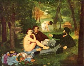 В Киеве есть такой Труханов остров. Пишу в Киеве, хотя он и не совсем в Киеве - остров на Днепре, но соединён мостами с обеими частями города - с правобережьем и левобережьем. Остров лесистый. В одном его месте, на мысе Добычка (с ударением на первом слоге), точнее на мысе Добычка-два, есть нудистский пляж. Гулял я как-то по лесу. Проходил мимо этого пляжа. Там голые женщины и мужчины загорают. Не ахти какое зрелище - привычное и в целом целомудренное. А вот дальше - уже за пределами пляжа, на полянке я увидел двух одетых мужчин и одну голую девушку. Шашлыки жарили у берега. Один мужик был даже в костюме. В летнем костюме. Так вот. Именно эта сценка врезалась мне в память. Хотя буквально за пять минут до того, я мог лицезреть с полсотни голых женщин. И тут я понял, что меня поразила не девушка, меня поразил АНТУРАЖ. Необычность этой сценки даёт пищу для самых неожиданных размышлений. Так и современников Мане поразил антураж. СОДЕРЖАНИЕ картины.