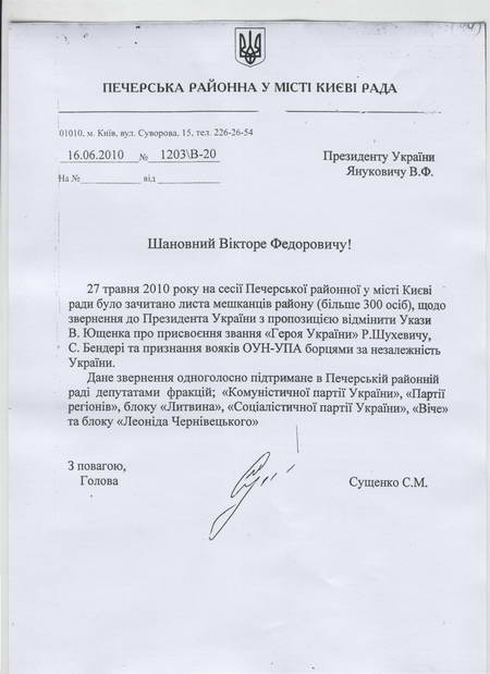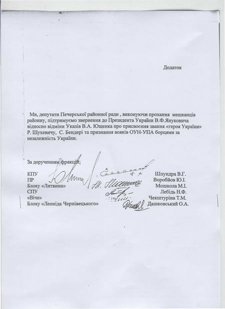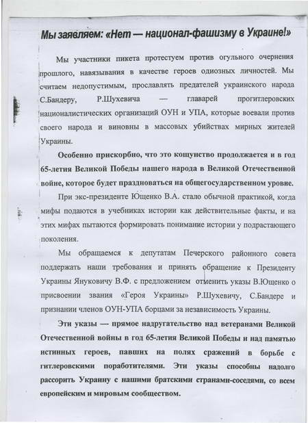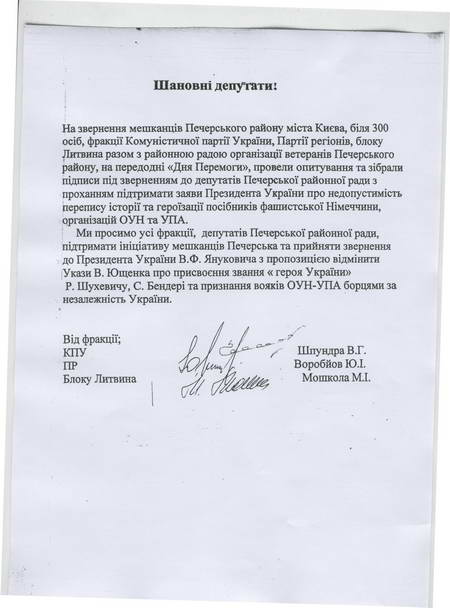 Коммунисты Печерского района совместно с ветеранской организацией организовали сбор подписей за отмену Р.Шухевичу и С.Бандере звания Герой Украины. Под давлением пикетов общественности столицы Украины депутаты Печерского райсовета вынуждены были определиться со своей политической позицией в этом вопросе.