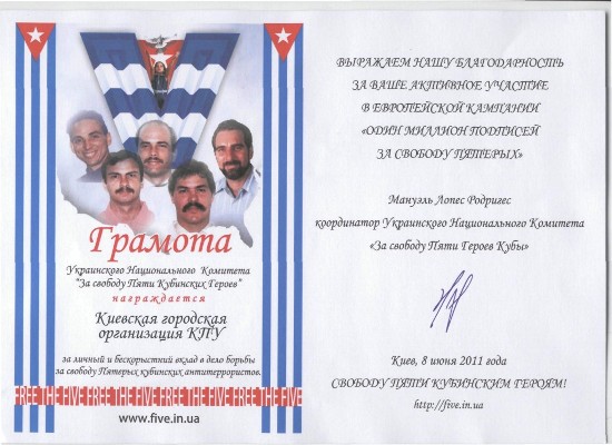 8 июня 2011 года представители Киевского городского комитета КПУ приняли участие в торжественном мероприятии возле памятника Хосе Марти в посольстве Республики Куба, во время которого они передали собранные коммунистами Киева подписи за свободу Пятерых.
