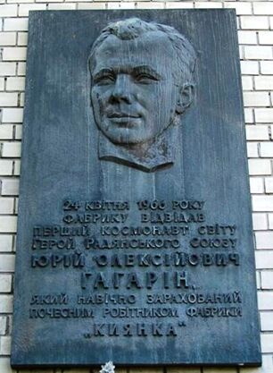 После гибели Гагарина на стене фабрики у входа установили бронзовую мемориальную доску с памятной надписью: «24 апреля 1966 года фабрику посетил первый космонавт мира Герой Советского Союза Юрий Алексеевич Гагарин, который навечно зачислен почетным работником фабрики «Киянка». Авторы доски – скульптор А. Скобликов и архитектор В. Гнездилов (В. Гнездилов к тому же еще и соавтор памятника Пушкину в Киеве и памятника «Навіки разом» в честь 300-летия воссоединения Украины с Россией в Переяславе-Хмельницком).