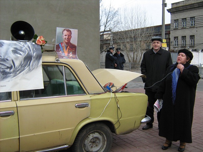 Спасибо Голосеевскому райкому партии, подогнавшему к стенам «Киянки» агитмашину, обклеенную плакатами с изображением коммуниста Юрия Гагарина, обеспечившего трансляцию «гагаринских» песен, развернувшего Красные знамена, воссоздавшего на этой «маленькой земле» советский дух патриотизма. Жаль, что цветы возлагать было некуда…. Жаль и того, что никто из нынешней администрации, профкома, и просто работников – почтить память Гагарина так и не вышел…