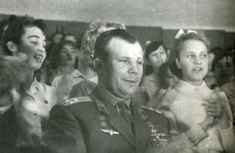 Юрий Гагарин в гостях у трикотажной фабрики "Киянка" Через два часа дорогого гостя принимали во Дворце пионеров и школьников, расположенном над Днепром, где проходил слет комсомольцев — учеников старших классов городов-героев Киева, Ленинграда, Севастополя, Одессы и крепости-героя Бреста. Гагарин выступил перед делегатами. "Мне очень приятно, — сказал он, — что впервые довелось побывать в Киеве, встретиться с юношами и девушками многих городов-героев и крепости Брест. Мне много рассказывал о красоте Киева мой друг Павел Попович, но то, что я увидел своими глазами, несравнимо с услышанным". Вместе с Юрием Алексеевичем в Киев приехала композитор Александра Пахмутова. Они ездили по Киеву и знакомились с городом: останавливались у памятников Тарасу Шевченко, Богдану Хмельницкому, Ленину, гуляли по Крещатику и в Лавре, а в конце дня встретились в издательстве "Радянська Україна" с журналистами. 25 апреля 1966 года в Октябрьском дворце Киева начал работу XX съезд комсомола Украины. В первом ряду президиума вместе с Гагариным сидели Петр Шелест, Владимир Щербицкий, Демьян Коротченко и другие руководители тогдашней Украины. Первую половину дня Юрий Алексеевич провел на съезде, в перерыве беседовал с делегатами, а после обеда побывал на трикотажной фабрике "Киянка" и встретился с членами бригады, которая носила его имя. На следующий день Гагарин и Пахмутова побывали на заводе "Арсенал". Рабочие очень тепло приняли гостей, а Юрий Гагарин передал в музей завода фотоаппарат "Салют" №670352, который был сделан в одном из цехов "Арсенала" и побывал в космосе.