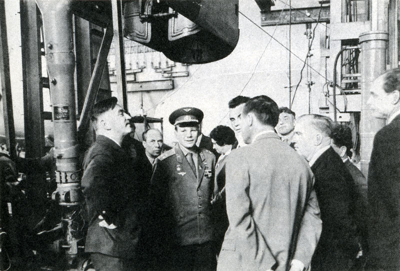 Герой Советского Союза, первый летчик-космонавт СССР Ю.А.Гагарин посетил Киевский авиазавод в дни работы XX съезда ЛКСМУ. Слева — авиаконструктор, академик О.К.Антонов, в центре — первый секретарь Киевского горкома комсомола К.И. Масик (Киев, апрель 1966 г.).