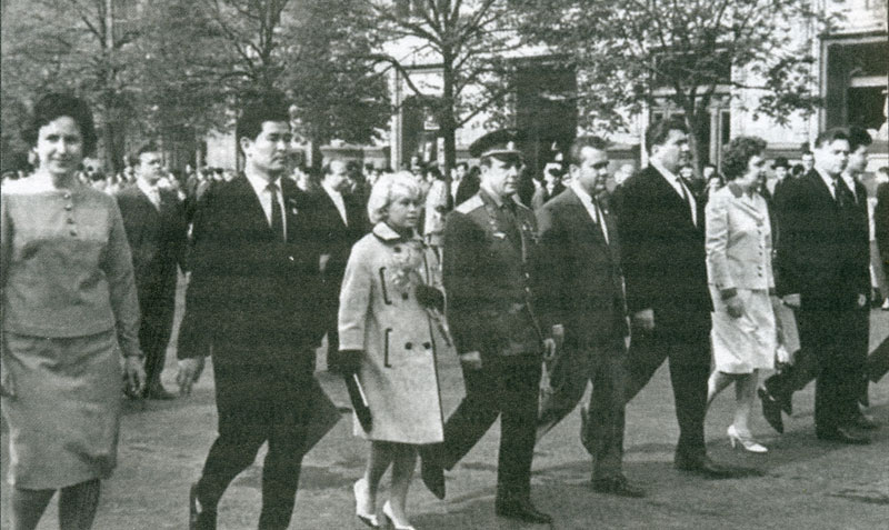 Делегаты и гости XX съезда ЛКСМУ возлагают цветы к памятнику В.И. Ленину. Справа налево: первый секретарь ЦК ЛКСМУ Ю.Н. Ельченко, первый секретарь ЦК ВЛКСМ С.П. Павлов, Ю.А. Гагарин, секретари ЦК ЛКСМУ B.C. Шевченко, Т.В. Главак. 1966 год.