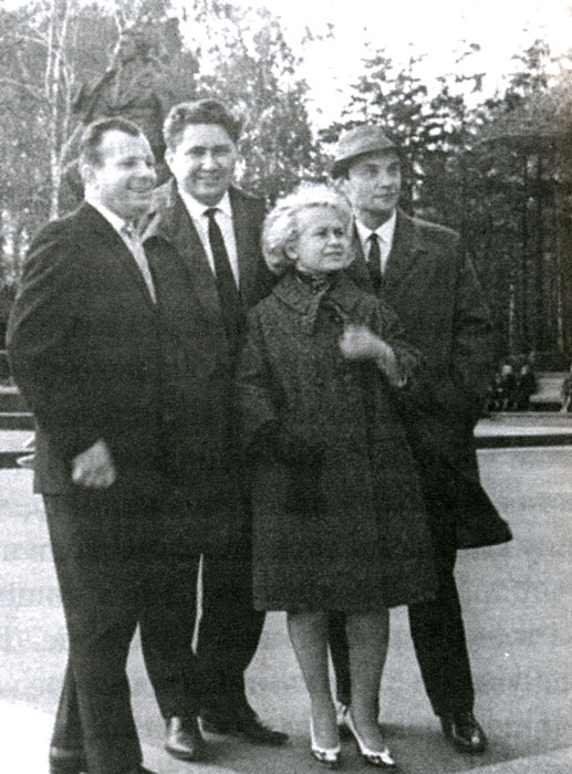Ю.А. Гагарин, Ю.Н. Ельченко, А.Н. Пахмутова и Н.Н. Добронравов в парке им. Пушкина. Киев. 1966 год.