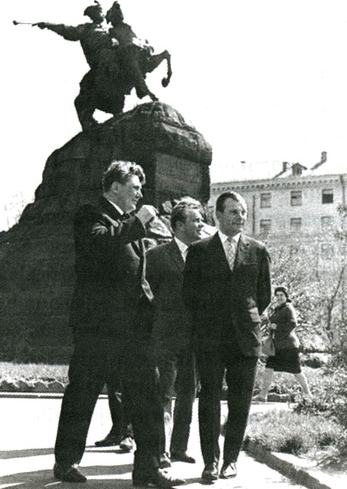 У памятника Богдану Хмельницкому. Слева направо: Ю.Н. Ельченко, С.П. Павлов, Ю.А. Гагарин. Киев. 1966 год.