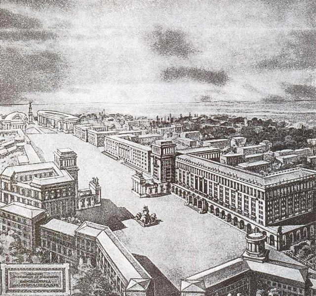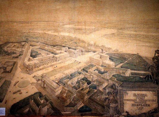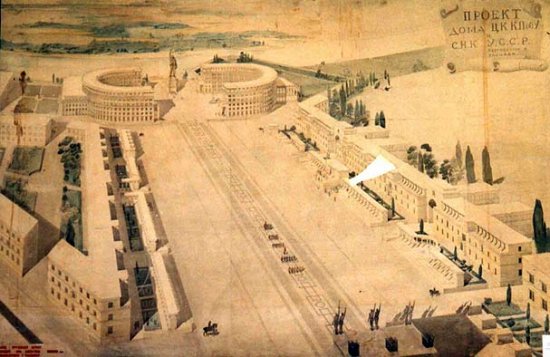 Впрочем, годом раньше, выступая на I съезде архитекторов Украины, кинорежиссёр А. П. Довженко отмечал: «Меня не удовлетворяет проект планирования Правительственной площади, […] не удовлетворяет памятник Ленину при высоте 70 метров и дома на этой площади высотой в 40 метров. Памятник будет подчеркивать, что эти дома маленькие, а он выше их, а Софиевская колокольня будет подчеркивать, что памятник маленький. Но не много ли чести для церкви соревноваться с Лениным? Я думаю — очень много чести». А потому Александр Петрович предлагал возвести на Правительственной площади два дома больше Софии, по 100-120 метров. При этом, неоднократно повторял он, будет «перекликание столетий — XI (София), XVII (колокольня) и XX. Доминантой в этом перекликании должны быть новопостроенные дома — дома эпохи бесклассового общества».