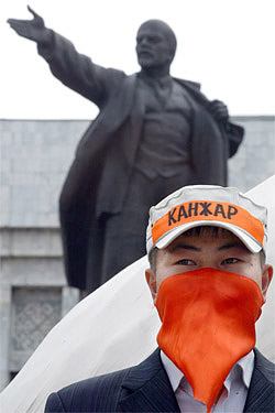 Участник митинга в Бишкеке на фоне памятника Ленину.