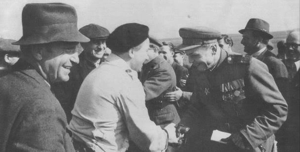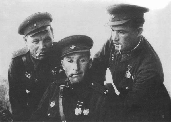 Участники освобождения Донбасса (слева направо): Герой Советского Союза бронебойщик Петр Болото, командир 40-й гвардейской стрелковой дивизии Дмитрий Казак и командир полка этой же дивизии Александр Епаншин (Южный фронт)