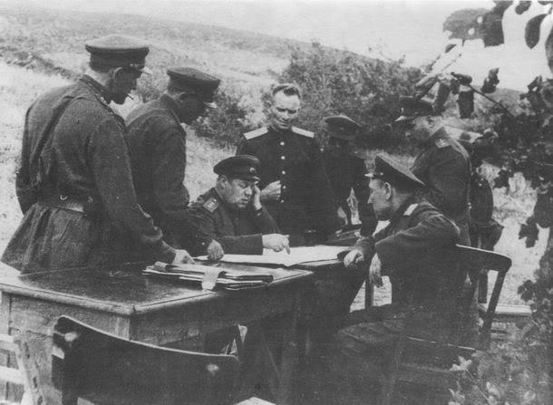 Август 1943 г. Обсуждение в штабе Южного фронта следующей операции. В центре (сидит) - командующий фронтом Ф. Толбухин, рядом - начальник штаба С.Бирюзов и член Военного совета фронта К.Гуров