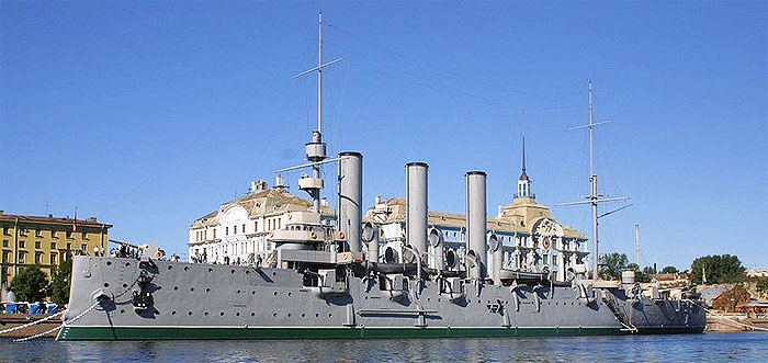 Крейсер был заложен в Санкт-Петербурге на судостроительной верфи "Новое-Адмиралтейство" 23 мая 1897 года, спущен на воду 11 мая 1900 года и вступил в строй боевых кораблей флота России в июле 1903 года. В период Русско-японской войны, совершив переход в составе 2-й Тихоокеанской Эскадры на Дальний Восток, крейсер "Аврора" принял боевое крещение в Цусимском сражении 14-15 мая 1905 года. Возвратившись в Балтийское море, "Аврора" длительный период плавала как учебный корабль, на котором проходили корабельную практику гардемарины Морского корпуса. В период Первой мировой войны крейсер "Аврора" принимал активное участие в боевых действиях на Балтийском море в составе 2-й бригады крейсеров, а в конце 1916 года был поставлен на ремонт в Петрограде.