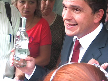 На фото К.Бондарев дає пояснення, навіщо його люди робили спробу роздачі горілки «Бондарев» людям, які прийшли на зустріч з народними депутатами БЮТ