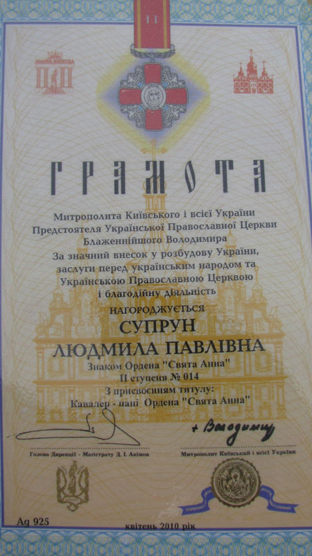 Першою серед нагороджених Грамотою та Знаком Ордена «Святої Анни» II ступеня була лідер Народно-демократичної партії, глава правління Українського фонду миру Людмила Супрун.